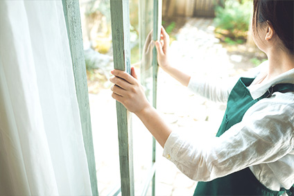 最近の家屋は昔に比べて気密性が高く、家のすき間を通しての自然換気だけでは充分な換気が得られません。不十分な換気は、室内にカビなどの菌を蔓延させてしまう原因になってしまいます。いつも清潔な状態を保てるように、室内の窓を開放し、外気を取込むことで、室内の湿気対策を行います。